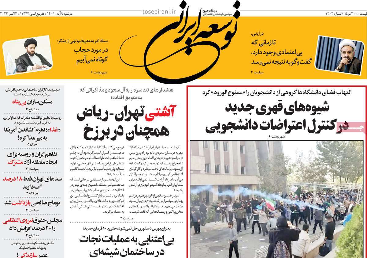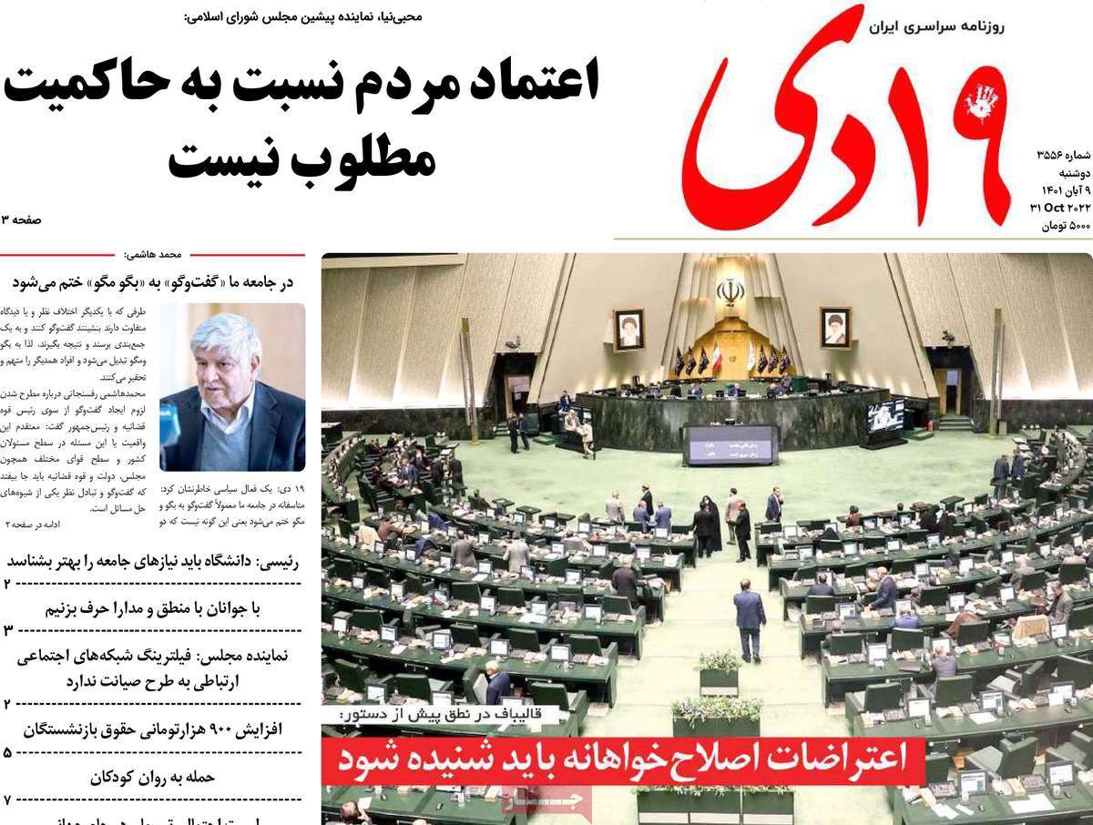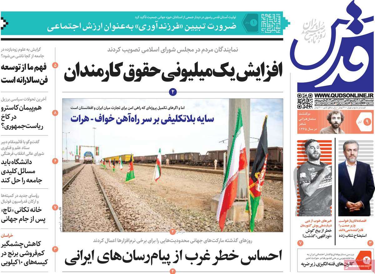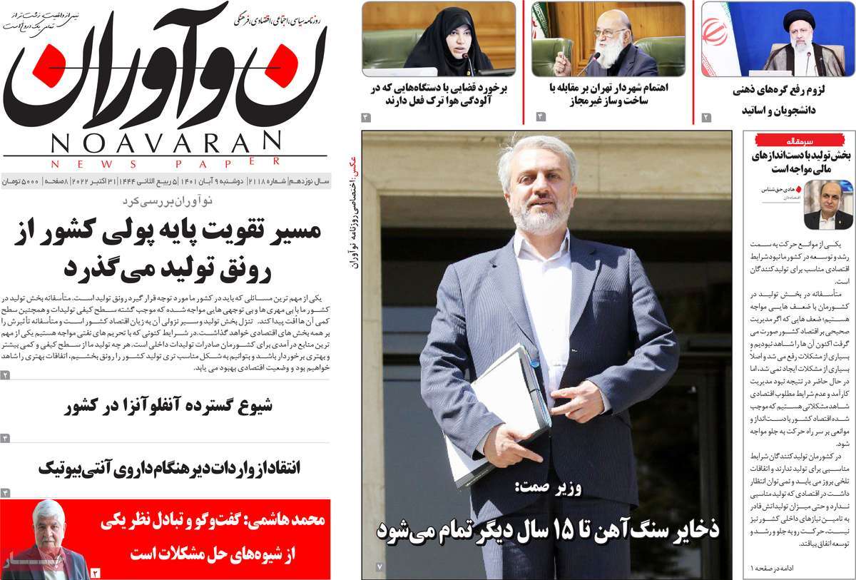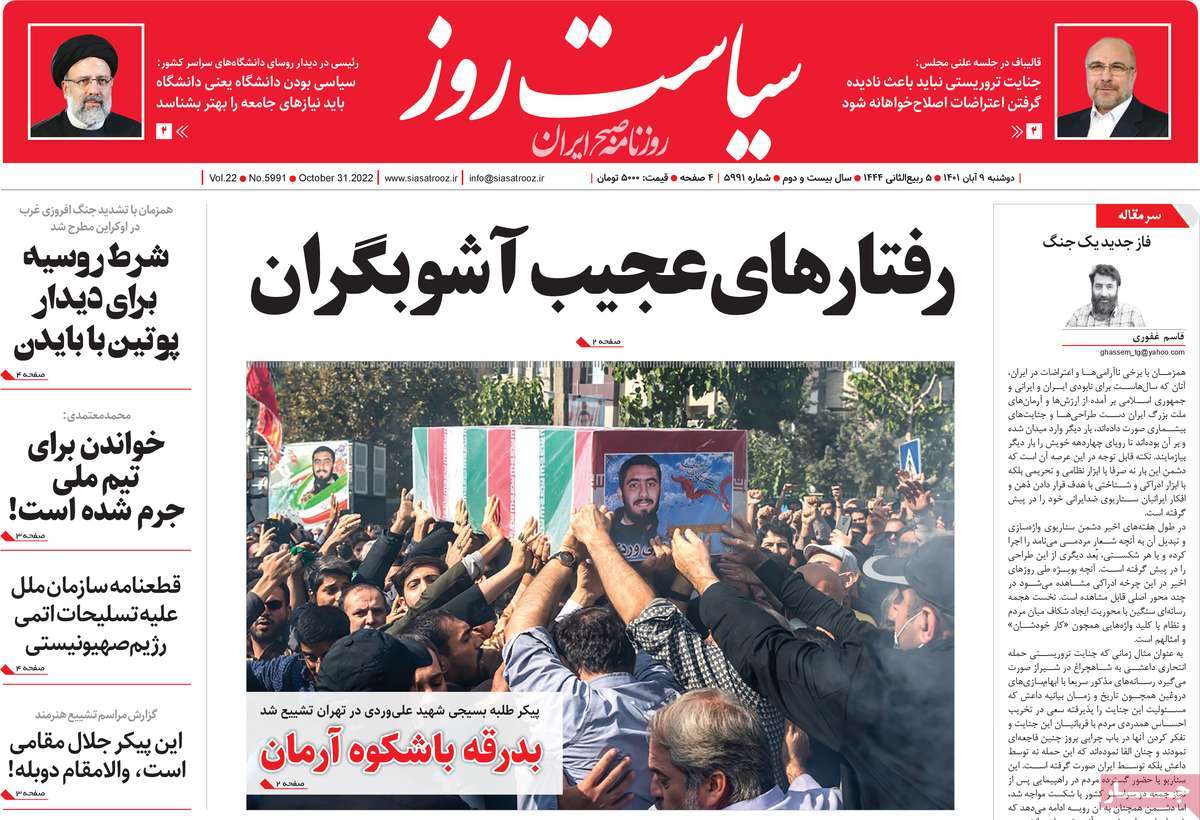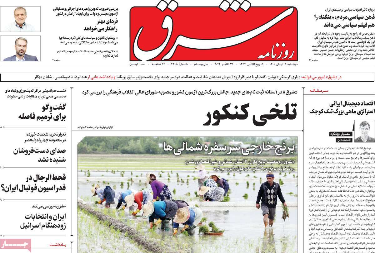 تاریخ انتشار: دوشنبه, ۹ آبان ۱۴۰۱ ساعت:8:09 صفحه نخست روزنامه های ۹ آبان ماه تجربه تلخ مذاکره با آمریکا را به هیچ عنوان تکرار نخواهیم کرد.آغاز زسیدگی به اتهامات بازداشتی ها.بسته درمانی در بازار سرمایه/هشدار آشوب انتخاباتی در آمریکا تصاویر صفحه نخست روزنامه های امروز دوشنبه ۹ آبان ماه ۱۴۰۱ را مشاهده می کنید Post Views: ۱۲ ارسال نظر لغو پاسخنشانی ایمیل شما منتشر نخواهد شد. بخشهای موردنیاز علامتگذاری شدهاند *نام * ایمیل * ذخیره نام، ایمیل و وبسایت من در مرورگر برای زمانی که دوباره دیدگاهی مینویسم. دیدگاه * آخرین اخبار ضرورت نقشآفرینی هنرمندان در ترویج ازدواج و فرزندآوریبرگزاری نخستین رویداد «هنر و رسانه جوانی جمعیت» در ساوهدنیا نیکیها را عاریه میدهدهشدار جدی امام صادق(ع) درباره غفلت از علماقتدار ایران نتیجه ایمان و فداکاری شهدا استاصلاحطلبان تندرو واقعیتها را با فضاسازی رسانهای پنهان میکندیادواره شهید سلیمانی در ساوه برگزار شدپیشوا خود را پیش از دیگران تعلیم میدهدنمایشگاه کتاب در ساوه افتتاح شداعزام کاروان سلامت به روستای مرق ساوهشگفتیهای آفرینش انسان در کلام امیرالمؤمنین (ع)معرفی بخشی از بهشتتجلیل از نخبگان شهرستان ساوه به مناسبت هفته فرهنگیاختتامیه فراخوان شعر «کلک فرهنگ» در ساوهکسب رتبه هشتم مرکزی در المپیاد استعدادهای کشورگرامیداشت روز پرستار با جلوهای از شکوه رضویکردار امروز ما فردایمان را رقم میزندگذشت برتر از استحقاق بندگان برای مجازات استپرستاران تجلی انسانیت و زندگی فاطمیانداجتماع و همبستگی بزرگ بانوان ساوجی در آیین «یاقوتهای سرخ» پر بازدیدها گرامیداشت روز پرستار در ساوهبرگزاری هفته فرهنگی ساوه با اجرای بیش از ۱۰۰ برنامه متنوعایران حلقه اتصال کریدور شمال،جنوب استانقلاب اسلامی حافظ اقتدار ملی است۳۵۰ کیلوگرم انار به سفره محرومان ساوه رسیدرسیدگی به بافتهای فرسوده نیازمند برنامه های بلندمدت استگناه سبب زوال نعمتهاستجشنواره پسته زرندیه وحدت مردمی در مسیر توسعه پایدار استگام بزرگ ساوه در مسیر توسعه و تحولفرماندار و نماینده مجلس از روستاهای ساوه بازدید کردند