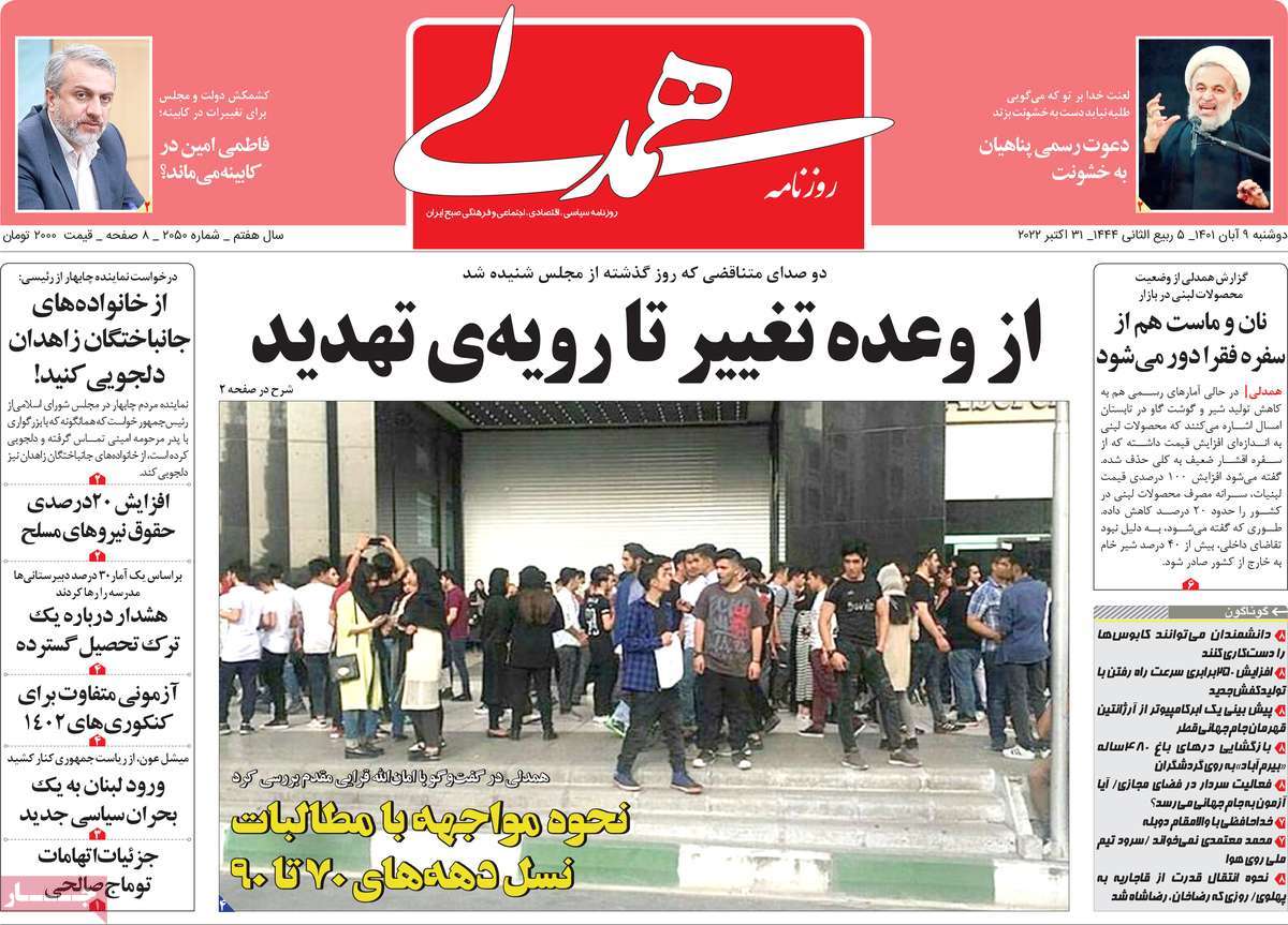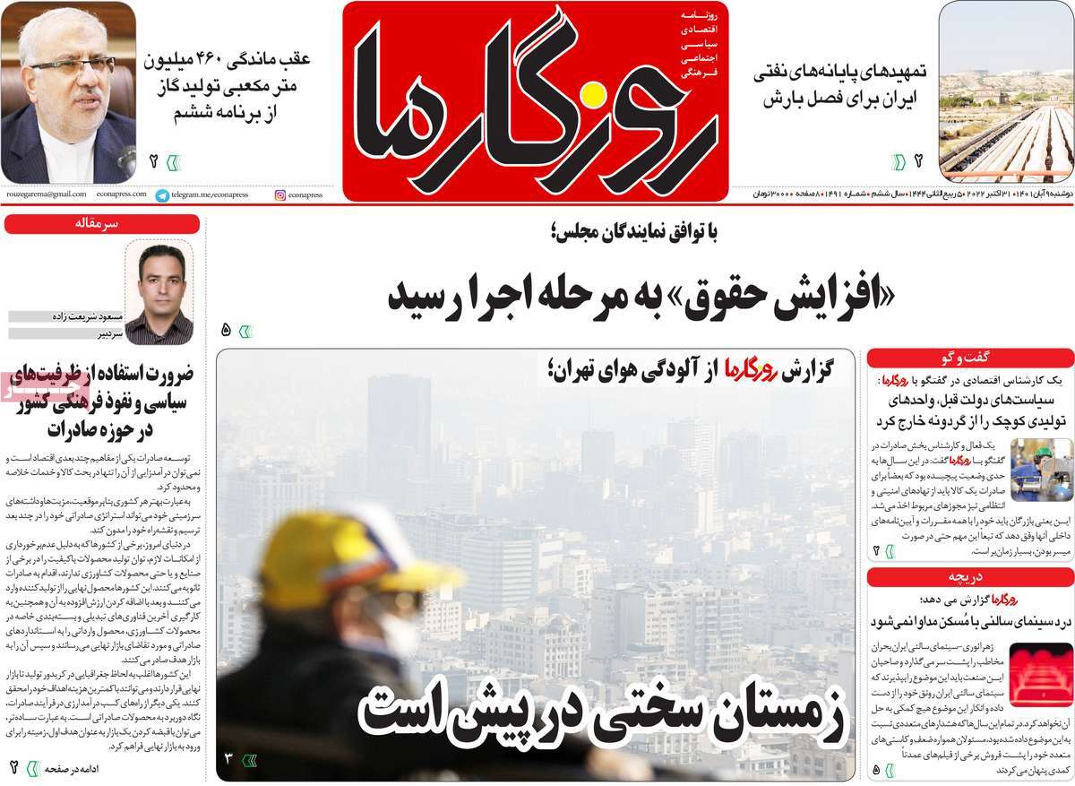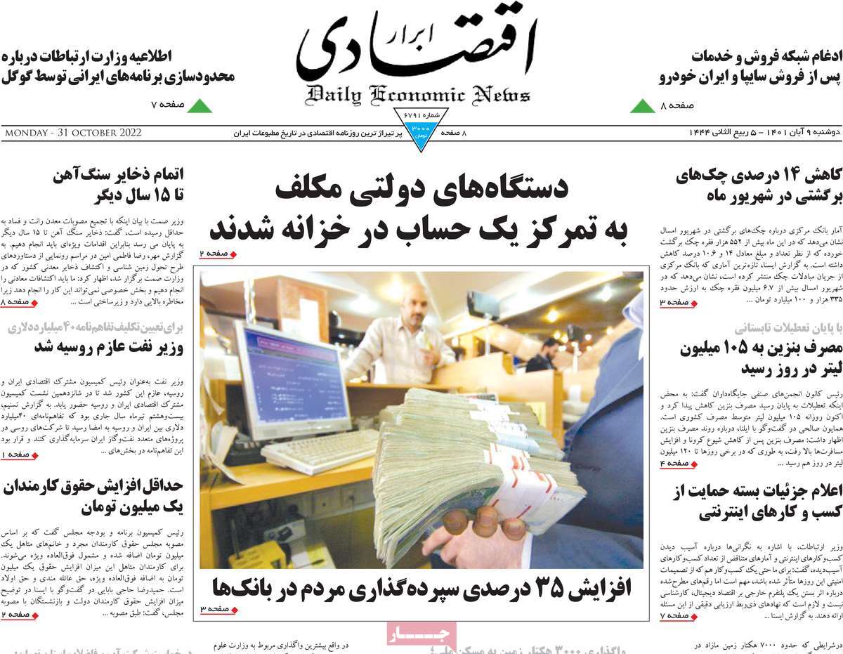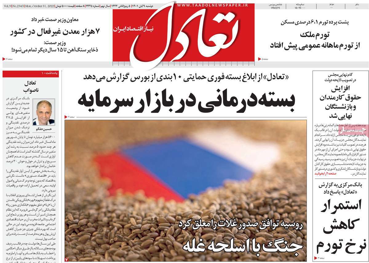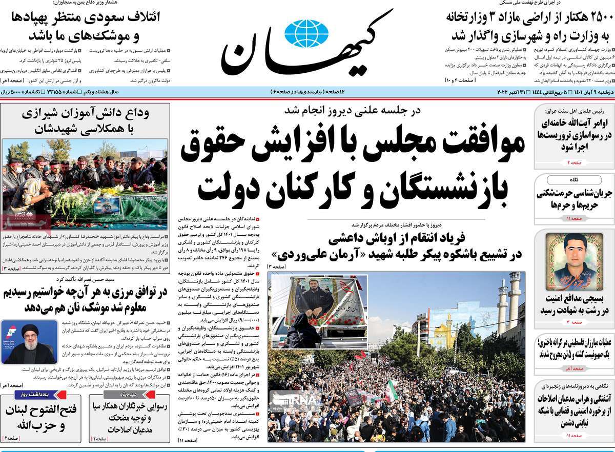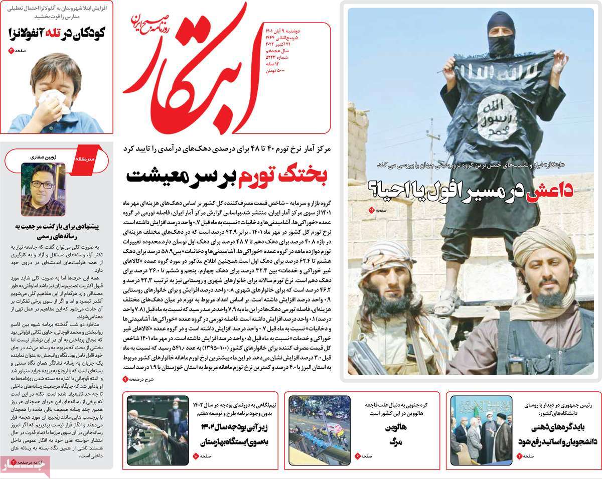 تاریخ انتشار: دوشنبه, ۹ آبان ۱۴۰۱ ساعت:8:09 صفحه نخست روزنامه های ۹ آبان ماه تجربه تلخ مذاکره با آمریکا را به هیچ عنوان تکرار نخواهیم کرد.آغاز زسیدگی به اتهامات بازداشتی ها.بسته درمانی در بازار سرمایه/هشدار آشوب انتخاباتی در آمریکا تصاویر صفحه نخست روزنامه های امروز دوشنبه ۹ آبان ماه ۱۴۰۱ را مشاهده می کنید Post Views: ۱۲ ارسال نظر لغو پاسخنشانی ایمیل شما منتشر نخواهد شد. بخشهای موردنیاز علامتگذاری شدهاند *نام * ایمیل * ذخیره نام، ایمیل و وبسایت من در مرورگر برای زمانی که دوباره دیدگاهی مینویسم. دیدگاه * آخرین اخبار ضرورت نقشآفرینی هنرمندان در ترویج ازدواج و فرزندآوریبرگزاری نخستین رویداد «هنر و رسانه جوانی جمعیت» در ساوهدنیا نیکیها را عاریه میدهدهشدار جدی امام صادق(ع) درباره غفلت از علماقتدار ایران نتیجه ایمان و فداکاری شهدا استاصلاحطلبان تندرو واقعیتها را با فضاسازی رسانهای پنهان میکندیادواره شهید سلیمانی در ساوه برگزار شدپیشوا خود را پیش از دیگران تعلیم میدهدنمایشگاه کتاب در ساوه افتتاح شداعزام کاروان سلامت به روستای مرق ساوهشگفتیهای آفرینش انسان در کلام امیرالمؤمنین (ع)معرفی بخشی از بهشتتجلیل از نخبگان شهرستان ساوه به مناسبت هفته فرهنگیاختتامیه فراخوان شعر «کلک فرهنگ» در ساوهکسب رتبه هشتم مرکزی در المپیاد استعدادهای کشورگرامیداشت روز پرستار با جلوهای از شکوه رضویکردار امروز ما فردایمان را رقم میزندگذشت برتر از استحقاق بندگان برای مجازات استپرستاران تجلی انسانیت و زندگی فاطمیانداجتماع و همبستگی بزرگ بانوان ساوجی در آیین «یاقوتهای سرخ» پر بازدیدها گرامیداشت روز پرستار در ساوهبرگزاری هفته فرهنگی ساوه با اجرای بیش از ۱۰۰ برنامه متنوعایران حلقه اتصال کریدور شمال،جنوب استانقلاب اسلامی حافظ اقتدار ملی است۳۵۰ کیلوگرم انار به سفره محرومان ساوه رسیدرسیدگی به بافتهای فرسوده نیازمند برنامه های بلندمدت استگناه سبب زوال نعمتهاستجشنواره پسته زرندیه وحدت مردمی در مسیر توسعه پایدار استگام بزرگ ساوه در مسیر توسعه و تحولفرماندار و نماینده مجلس از روستاهای ساوه بازدید کردند