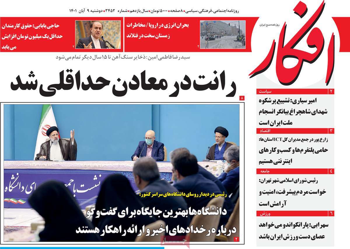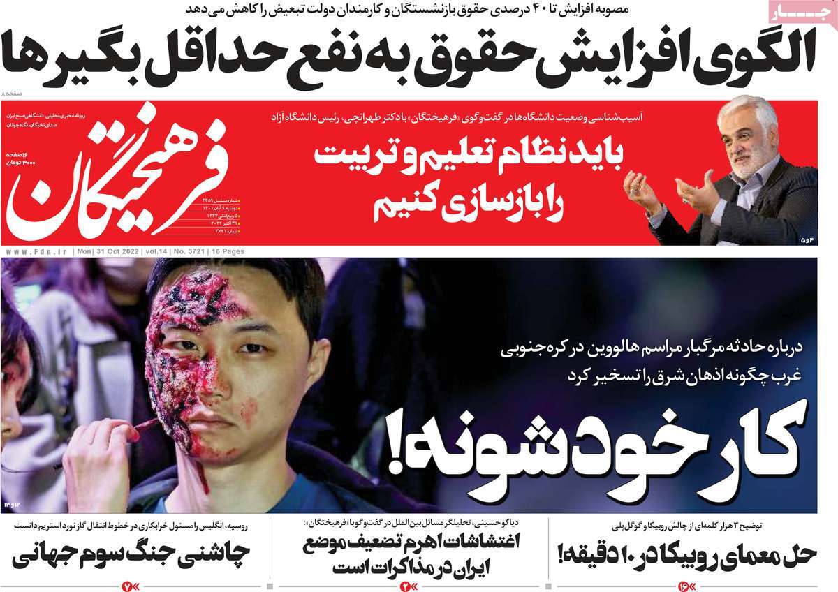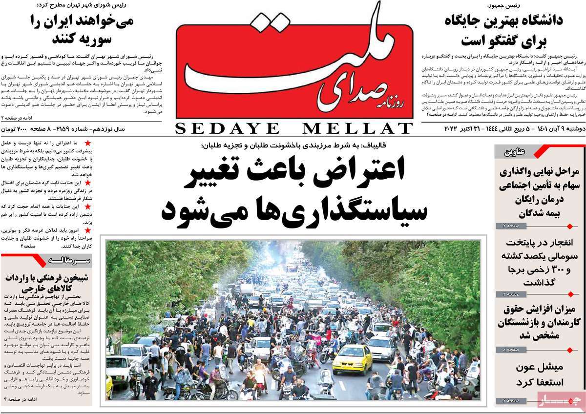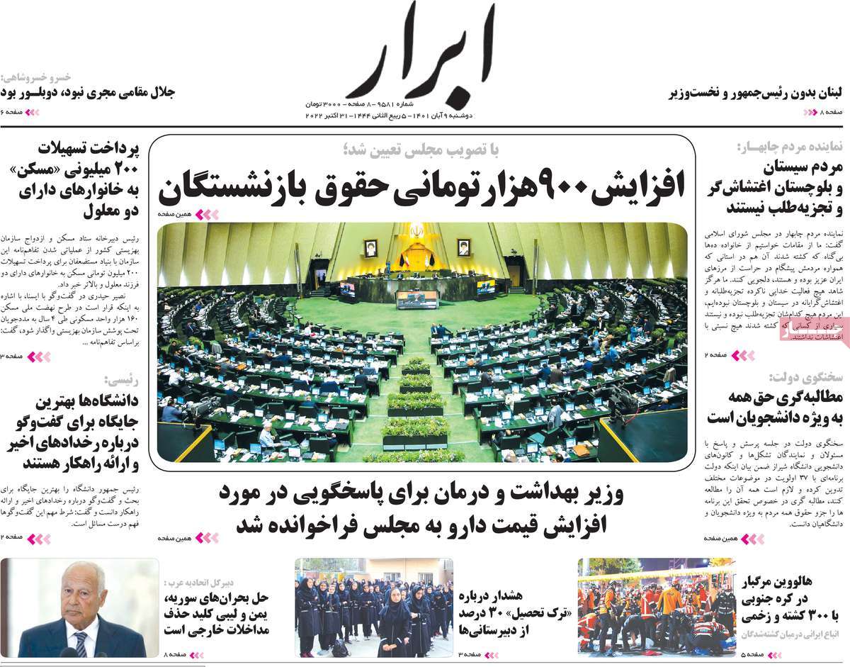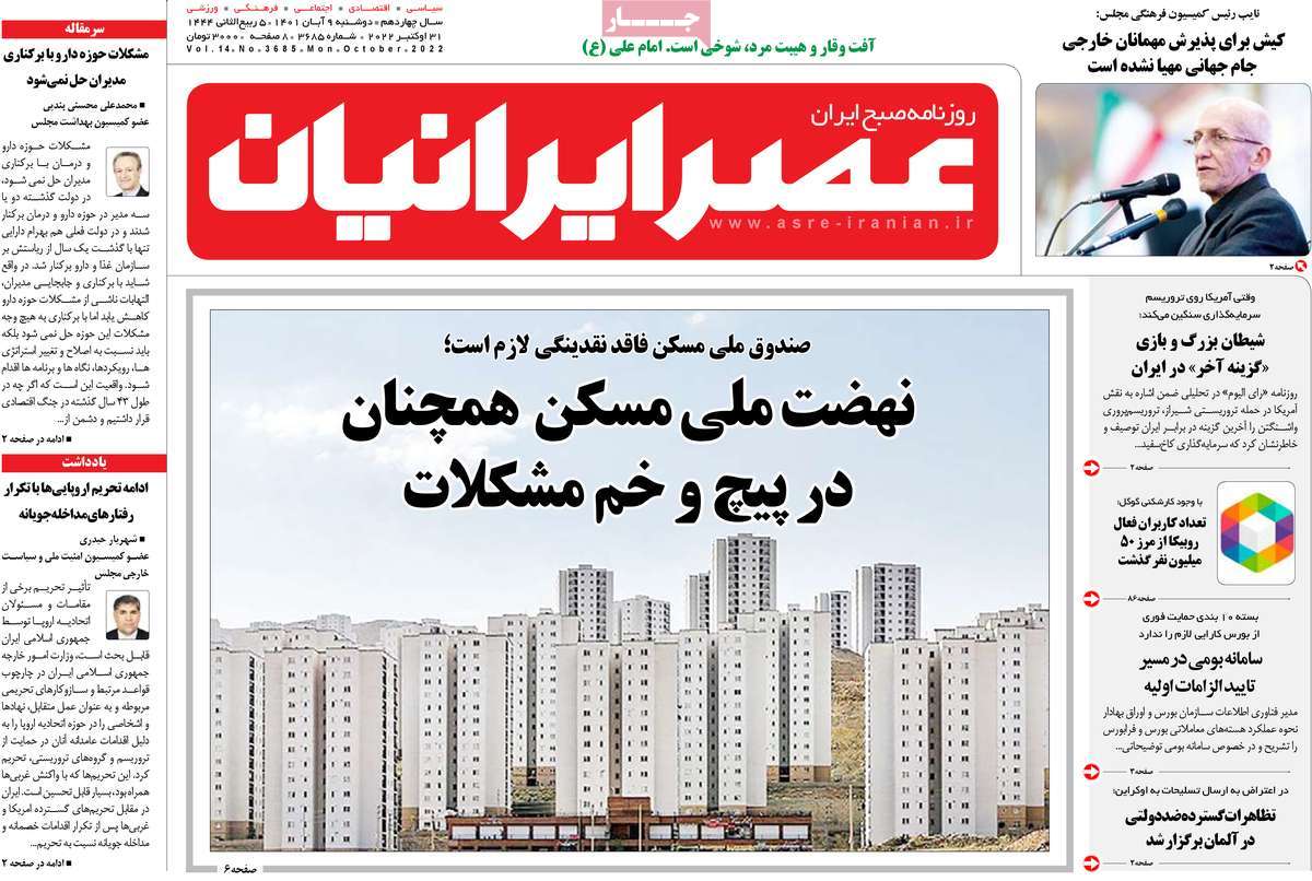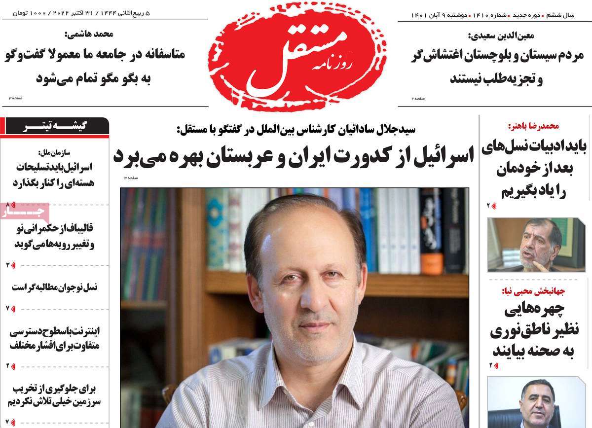 تاریخ انتشار: دوشنبه, ۹ آبان ۱۴۰۱ ساعت:8:09 صفحه نخست روزنامه های ۹ آبان ماه تجربه تلخ مذاکره با آمریکا را به هیچ عنوان تکرار نخواهیم کرد.آغاز زسیدگی به اتهامات بازداشتی ها.بسته درمانی در بازار سرمایه/هشدار آشوب انتخاباتی در آمریکا تصاویر صفحه نخست روزنامه های امروز دوشنبه ۹ آبان ماه ۱۴۰۱ را مشاهده می کنید Post Views: ۱۲ ارسال نظر لغو پاسخنشانی ایمیل شما منتشر نخواهد شد. بخشهای موردنیاز علامتگذاری شدهاند *نام * ایمیل * ذخیره نام، ایمیل و وبسایت من در مرورگر برای زمانی که دوباره دیدگاهی مینویسم. دیدگاه * آخرین اخبار ضرورت نقشآفرینی هنرمندان در ترویج ازدواج و فرزندآوریبرگزاری نخستین رویداد «هنر و رسانه جوانی جمعیت» در ساوهدنیا نیکیها را عاریه میدهدهشدار جدی امام صادق(ع) درباره غفلت از علماقتدار ایران نتیجه ایمان و فداکاری شهدا استاصلاحطلبان تندرو واقعیتها را با فضاسازی رسانهای پنهان میکندیادواره شهید سلیمانی در ساوه برگزار شدپیشوا خود را پیش از دیگران تعلیم میدهدنمایشگاه کتاب در ساوه افتتاح شداعزام کاروان سلامت به روستای مرق ساوهشگفتیهای آفرینش انسان در کلام امیرالمؤمنین (ع)معرفی بخشی از بهشتتجلیل از نخبگان شهرستان ساوه به مناسبت هفته فرهنگیاختتامیه فراخوان شعر «کلک فرهنگ» در ساوهکسب رتبه هشتم مرکزی در المپیاد استعدادهای کشورگرامیداشت روز پرستار با جلوهای از شکوه رضویکردار امروز ما فردایمان را رقم میزندگذشت برتر از استحقاق بندگان برای مجازات استپرستاران تجلی انسانیت و زندگی فاطمیانداجتماع و همبستگی بزرگ بانوان ساوجی در آیین «یاقوتهای سرخ» پر بازدیدها گرامیداشت روز پرستار در ساوهبرگزاری هفته فرهنگی ساوه با اجرای بیش از ۱۰۰ برنامه متنوعایران حلقه اتصال کریدور شمال،جنوب استانقلاب اسلامی حافظ اقتدار ملی است۳۵۰ کیلوگرم انار به سفره محرومان ساوه رسیدرسیدگی به بافتهای فرسوده نیازمند برنامه های بلندمدت استگناه سبب زوال نعمتهاستجشنواره پسته زرندیه وحدت مردمی در مسیر توسعه پایدار استگام بزرگ ساوه در مسیر توسعه و تحولفرماندار و نماینده مجلس از روستاهای ساوه بازدید کردند