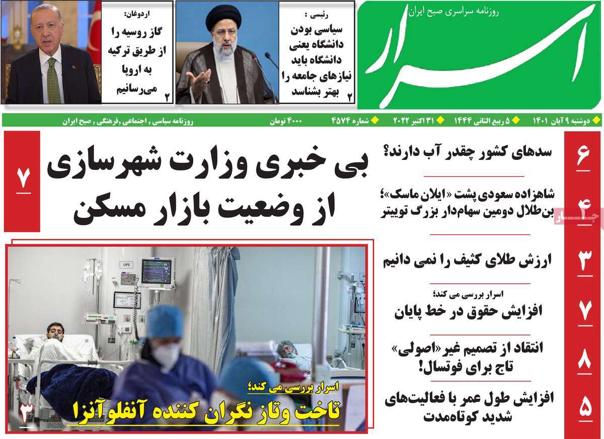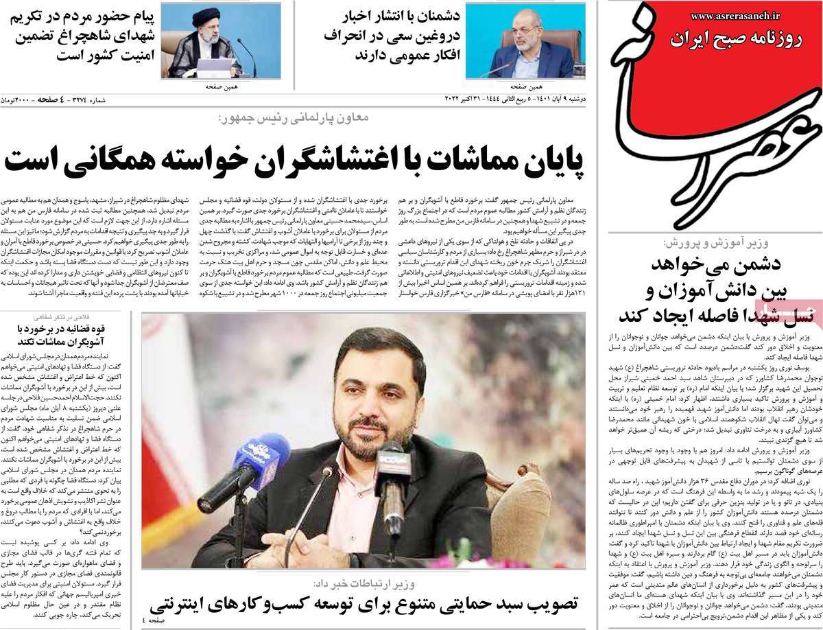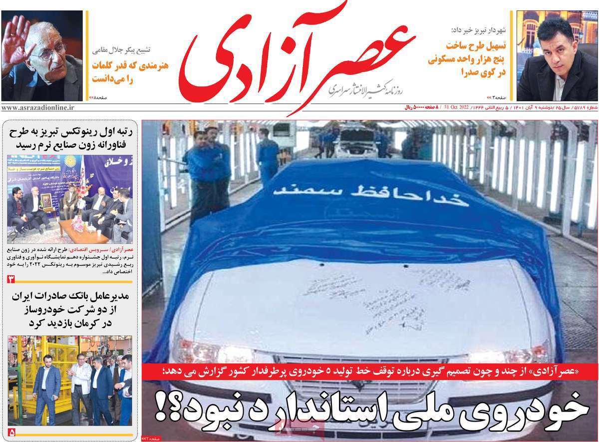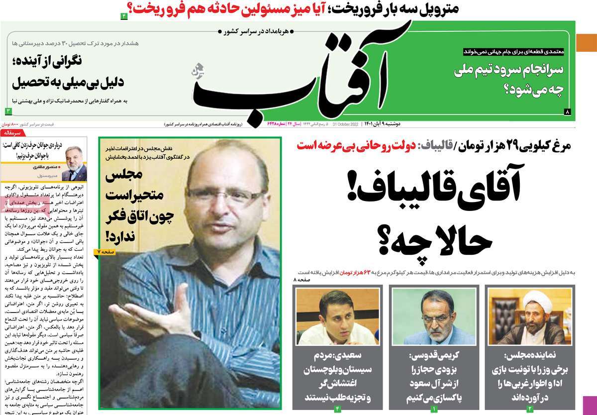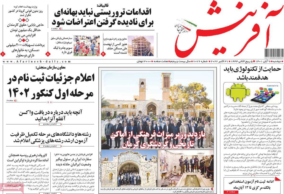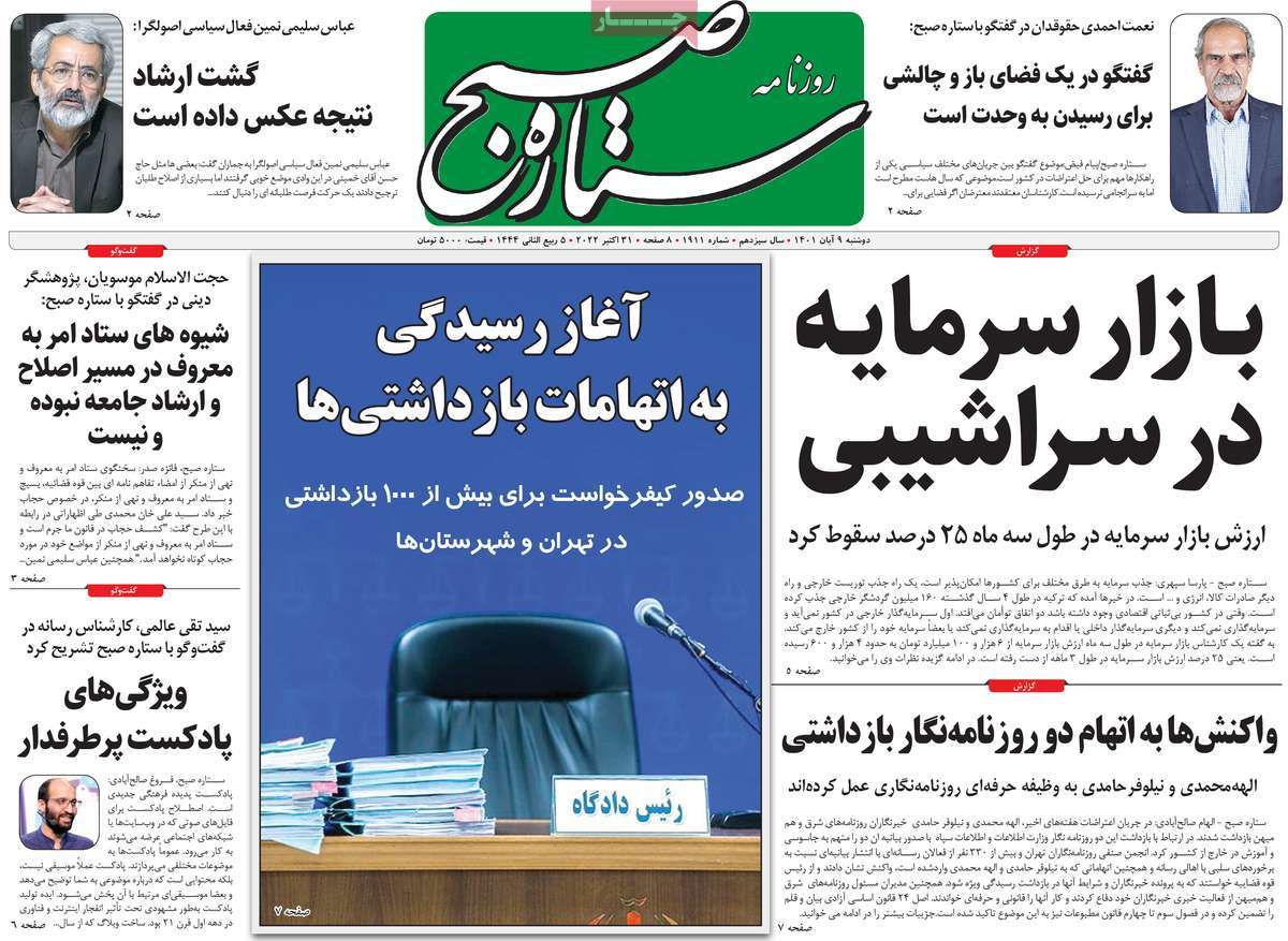 تاریخ انتشار: دوشنبه, ۹ آبان ۱۴۰۱ ساعت:8:09 صفحه نخست روزنامه های ۹ آبان ماه تجربه تلخ مذاکره با آمریکا را به هیچ عنوان تکرار نخواهیم کرد.آغاز زسیدگی به اتهامات بازداشتی ها.بسته درمانی در بازار سرمایه/هشدار آشوب انتخاباتی در آمریکا تصاویر صفحه نخست روزنامه های امروز دوشنبه ۹ آبان ماه ۱۴۰۱ را مشاهده می کنید Post Views: ۱۲ ارسال نظر لغو پاسخنشانی ایمیل شما منتشر نخواهد شد. بخشهای موردنیاز علامتگذاری شدهاند *نام * ایمیل * ذخیره نام، ایمیل و وبسایت من در مرورگر برای زمانی که دوباره دیدگاهی مینویسم. دیدگاه * آخرین اخبار ضرورت نقشآفرینی هنرمندان در ترویج ازدواج و فرزندآوریبرگزاری نخستین رویداد «هنر و رسانه جوانی جمعیت» در ساوهدنیا نیکیها را عاریه میدهدهشدار جدی امام صادق(ع) درباره غفلت از علماقتدار ایران نتیجه ایمان و فداکاری شهدا استاصلاحطلبان تندرو واقعیتها را با فضاسازی رسانهای پنهان میکندیادواره شهید سلیمانی در ساوه برگزار شدپیشوا خود را پیش از دیگران تعلیم میدهدنمایشگاه کتاب در ساوه افتتاح شداعزام کاروان سلامت به روستای مرق ساوهشگفتیهای آفرینش انسان در کلام امیرالمؤمنین (ع)معرفی بخشی از بهشتتجلیل از نخبگان شهرستان ساوه به مناسبت هفته فرهنگیاختتامیه فراخوان شعر «کلک فرهنگ» در ساوهکسب رتبه هشتم مرکزی در المپیاد استعدادهای کشورگرامیداشت روز پرستار با جلوهای از شکوه رضویکردار امروز ما فردایمان را رقم میزندگذشت برتر از استحقاق بندگان برای مجازات استپرستاران تجلی انسانیت و زندگی فاطمیانداجتماع و همبستگی بزرگ بانوان ساوجی در آیین «یاقوتهای سرخ» پر بازدیدها گرامیداشت روز پرستار در ساوهبرگزاری هفته فرهنگی ساوه با اجرای بیش از ۱۰۰ برنامه متنوعایران حلقه اتصال کریدور شمال،جنوب استانقلاب اسلامی حافظ اقتدار ملی است۳۵۰ کیلوگرم انار به سفره محرومان ساوه رسیدرسیدگی به بافتهای فرسوده نیازمند برنامه های بلندمدت استگناه سبب زوال نعمتهاستجشنواره پسته زرندیه وحدت مردمی در مسیر توسعه پایدار استگام بزرگ ساوه در مسیر توسعه و تحولفرماندار و نماینده مجلس از روستاهای ساوه بازدید کردند