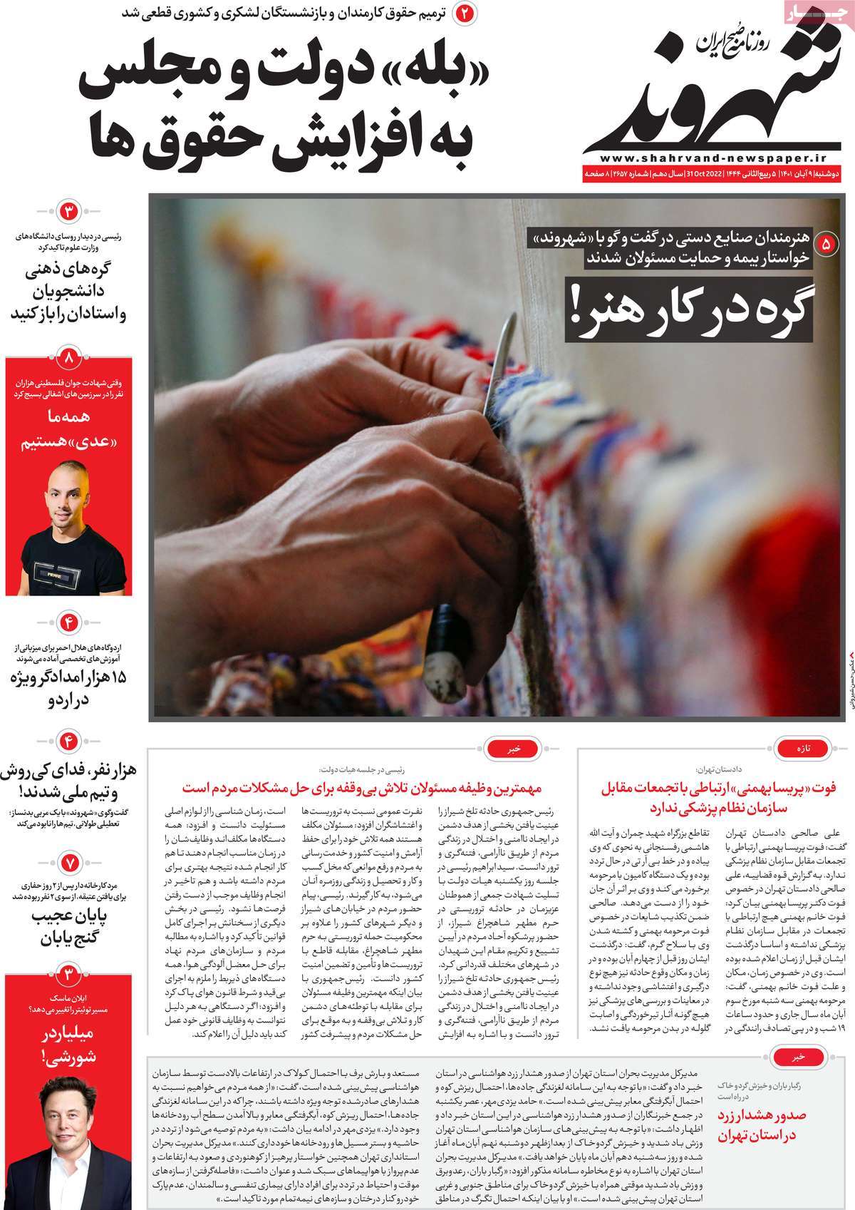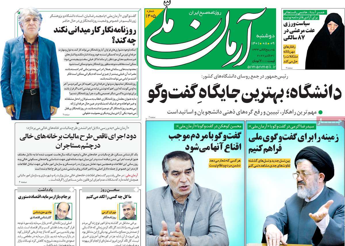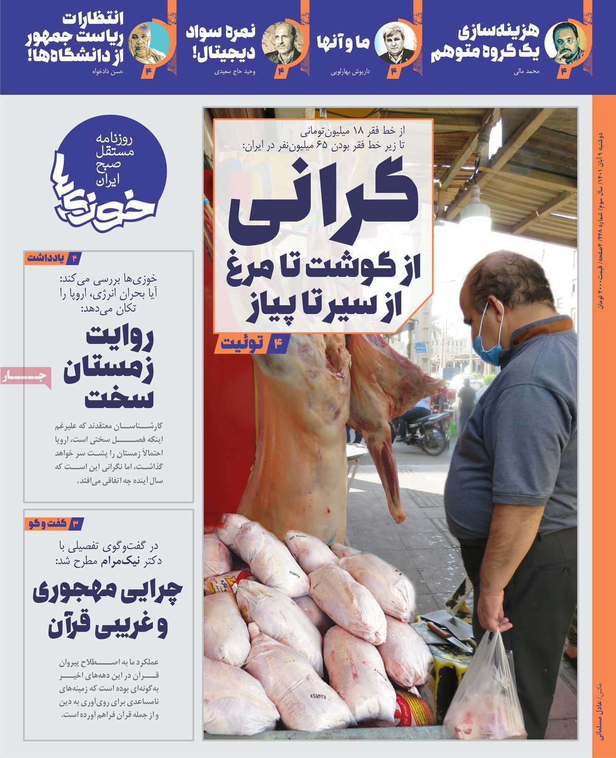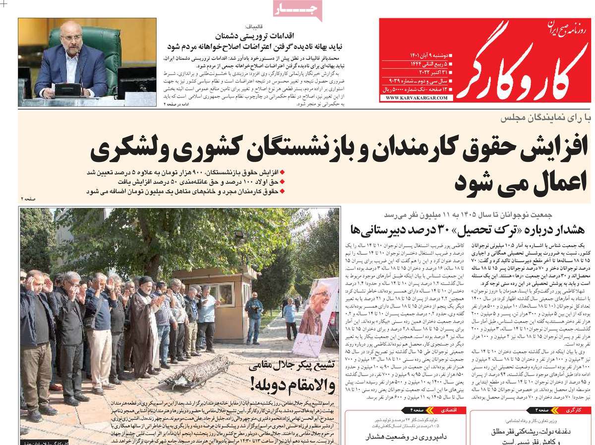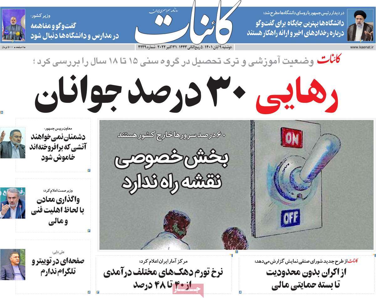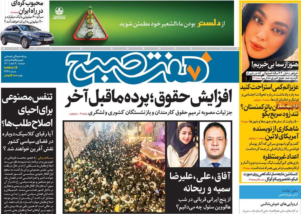 تاریخ انتشار: دوشنبه, ۹ آبان ۱۴۰۱ ساعت:8:09 صفحه نخست روزنامه های ۹ آبان ماه تجربه تلخ مذاکره با آمریکا را به هیچ عنوان تکرار نخواهیم کرد.آغاز زسیدگی به اتهامات بازداشتی ها.بسته درمانی در بازار سرمایه/هشدار آشوب انتخاباتی در آمریکا تصاویر صفحه نخست روزنامه های امروز دوشنبه ۹ آبان ماه ۱۴۰۱ را مشاهده می کنید Post Views: ۱۲ ارسال نظر لغو پاسخنشانی ایمیل شما منتشر نخواهد شد. بخشهای موردنیاز علامتگذاری شدهاند *نام * ایمیل * ذخیره نام، ایمیل و وبسایت من در مرورگر برای زمانی که دوباره دیدگاهی مینویسم. دیدگاه * آخرین اخبار ضرورت نقشآفرینی هنرمندان در ترویج ازدواج و فرزندآوریبرگزاری نخستین رویداد «هنر و رسانه جوانی جمعیت» در ساوهدنیا نیکیها را عاریه میدهدهشدار جدی امام صادق(ع) درباره غفلت از علماقتدار ایران نتیجه ایمان و فداکاری شهدا استاصلاحطلبان تندرو واقعیتها را با فضاسازی رسانهای پنهان میکندیادواره شهید سلیمانی در ساوه برگزار شدپیشوا خود را پیش از دیگران تعلیم میدهدنمایشگاه کتاب در ساوه افتتاح شداعزام کاروان سلامت به روستای مرق ساوهشگفتیهای آفرینش انسان در کلام امیرالمؤمنین (ع)معرفی بخشی از بهشتتجلیل از نخبگان شهرستان ساوه به مناسبت هفته فرهنگیاختتامیه فراخوان شعر «کلک فرهنگ» در ساوهکسب رتبه هشتم مرکزی در المپیاد استعدادهای کشورگرامیداشت روز پرستار با جلوهای از شکوه رضویکردار امروز ما فردایمان را رقم میزندگذشت برتر از استحقاق بندگان برای مجازات استپرستاران تجلی انسانیت و زندگی فاطمیانداجتماع و همبستگی بزرگ بانوان ساوجی در آیین «یاقوتهای سرخ» پر بازدیدها گرامیداشت روز پرستار در ساوهبرگزاری هفته فرهنگی ساوه با اجرای بیش از ۱۰۰ برنامه متنوعایران حلقه اتصال کریدور شمال،جنوب استانقلاب اسلامی حافظ اقتدار ملی است۳۵۰ کیلوگرم انار به سفره محرومان ساوه رسیدرسیدگی به بافتهای فرسوده نیازمند برنامه های بلندمدت استگناه سبب زوال نعمتهاستجشنواره پسته زرندیه وحدت مردمی در مسیر توسعه پایدار استگام بزرگ ساوه در مسیر توسعه و تحولفرماندار و نماینده مجلس از روستاهای ساوه بازدید کردند