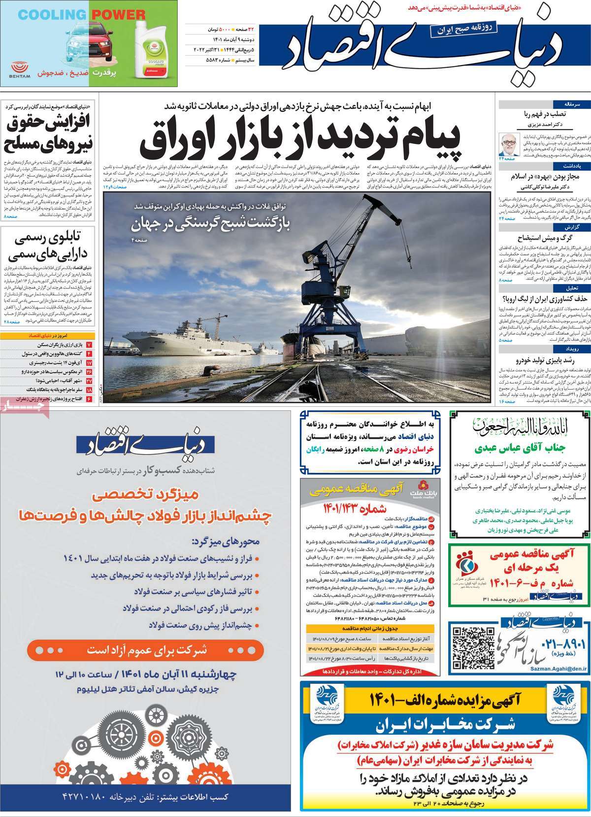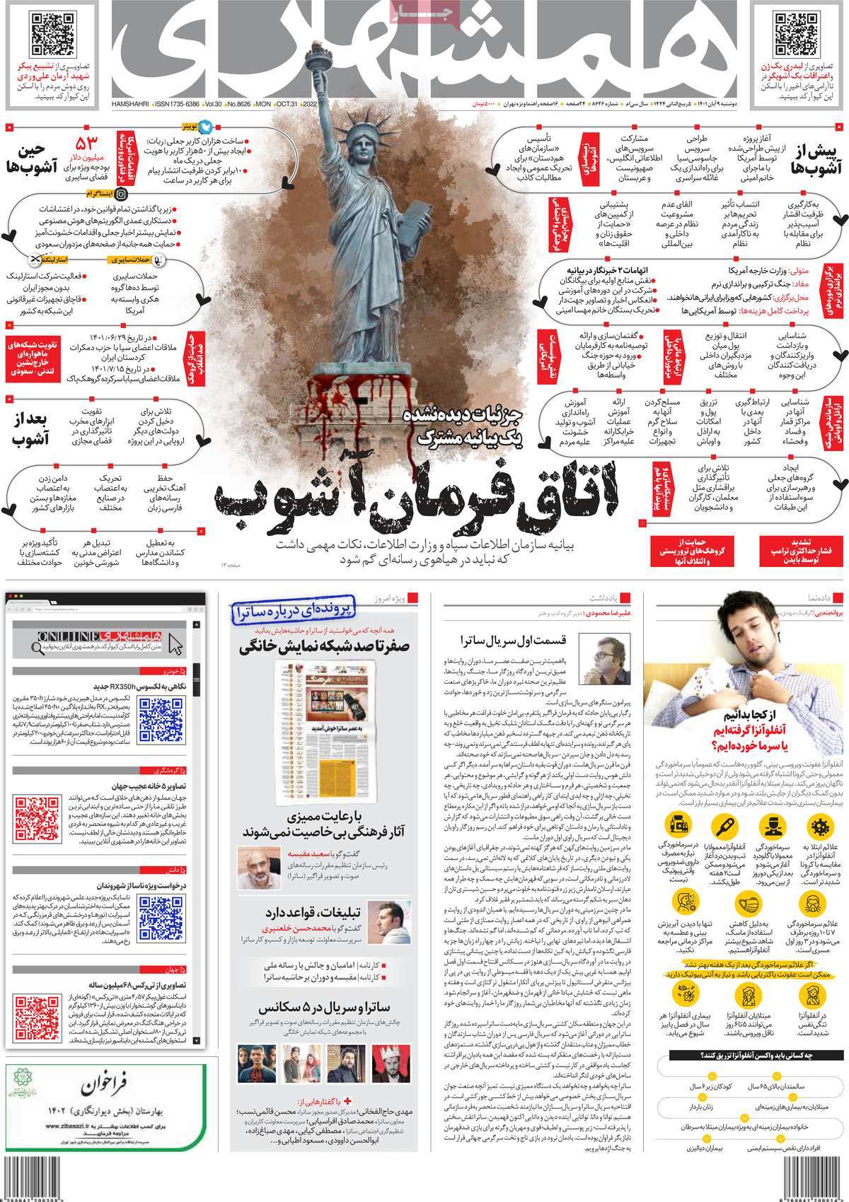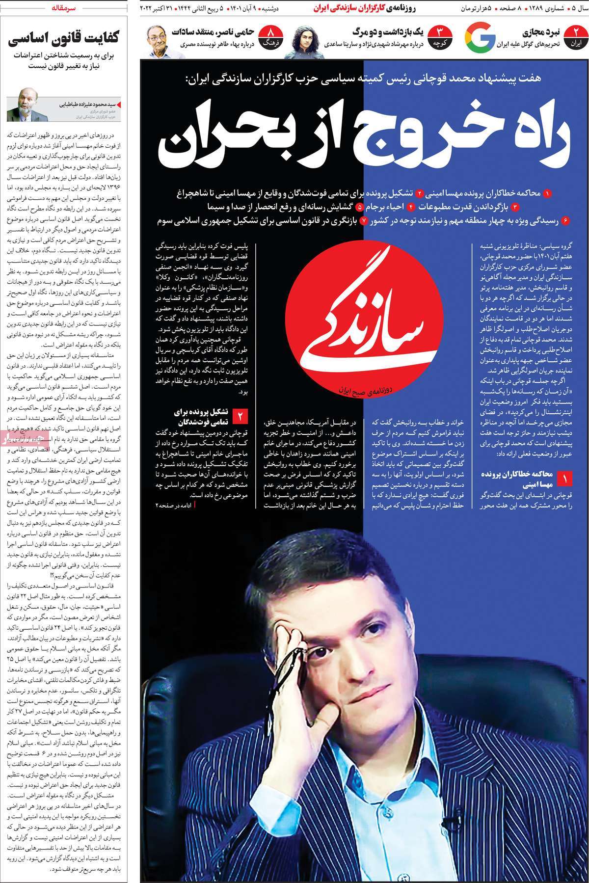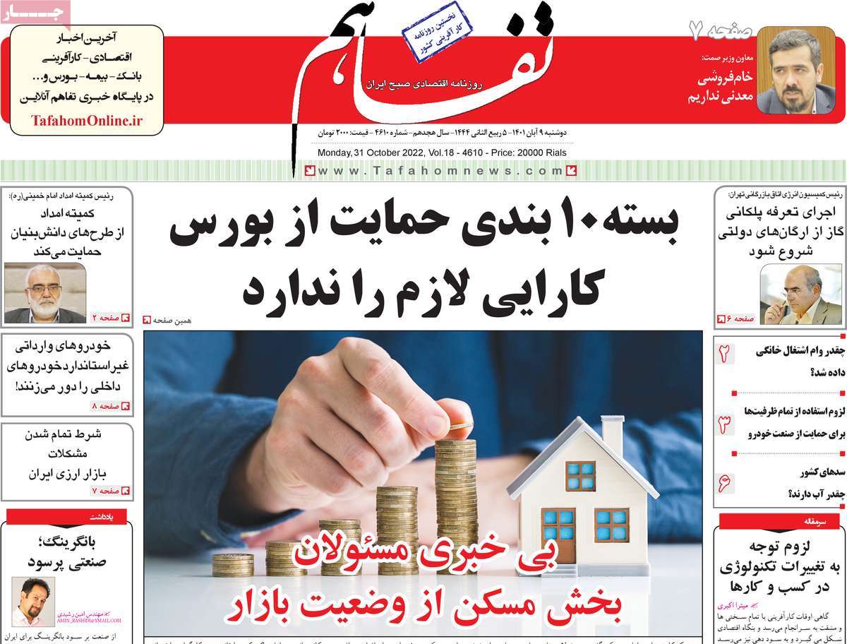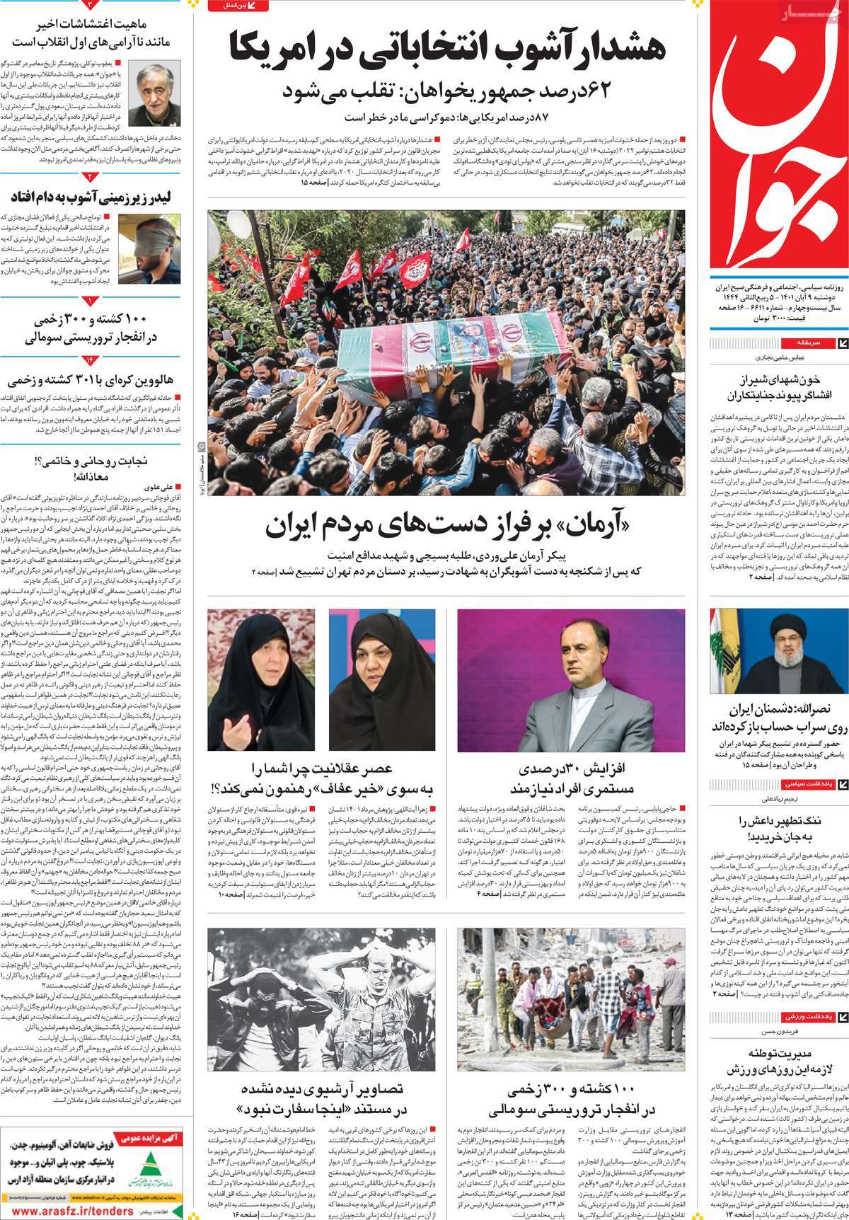 تاریخ انتشار: دوشنبه, ۹ آبان ۱۴۰۱ ساعت:8:09 صفحه نخست روزنامه های ۹ آبان ماه تجربه تلخ مذاکره با آمریکا را به هیچ عنوان تکرار نخواهیم کرد.آغاز زسیدگی به اتهامات بازداشتی ها.بسته درمانی در بازار سرمایه/هشدار آشوب انتخاباتی در آمریکا تصاویر صفحه نخست روزنامه های امروز دوشنبه ۹ آبان ماه ۱۴۰۱ را مشاهده می کنید Post Views: ۱۲ ارسال نظر لغو پاسخنشانی ایمیل شما منتشر نخواهد شد. بخشهای موردنیاز علامتگذاری شدهاند *نام * ایمیل * ذخیره نام، ایمیل و وبسایت من در مرورگر برای زمانی که دوباره دیدگاهی مینویسم. دیدگاه * آخرین اخبار ضرورت نقشآفرینی هنرمندان در ترویج ازدواج و فرزندآوریبرگزاری نخستین رویداد «هنر و رسانه جوانی جمعیت» در ساوهدنیا نیکیها را عاریه میدهدهشدار جدی امام صادق(ع) درباره غفلت از علماقتدار ایران نتیجه ایمان و فداکاری شهدا استاصلاحطلبان تندرو واقعیتها را با فضاسازی رسانهای پنهان میکندیادواره شهید سلیمانی در ساوه برگزار شدپیشوا خود را پیش از دیگران تعلیم میدهدنمایشگاه کتاب در ساوه افتتاح شداعزام کاروان سلامت به روستای مرق ساوهشگفتیهای آفرینش انسان در کلام امیرالمؤمنین (ع)معرفی بخشی از بهشتتجلیل از نخبگان شهرستان ساوه به مناسبت هفته فرهنگیاختتامیه فراخوان شعر «کلک فرهنگ» در ساوهکسب رتبه هشتم مرکزی در المپیاد استعدادهای کشورگرامیداشت روز پرستار با جلوهای از شکوه رضویکردار امروز ما فردایمان را رقم میزندگذشت برتر از استحقاق بندگان برای مجازات استپرستاران تجلی انسانیت و زندگی فاطمیانداجتماع و همبستگی بزرگ بانوان ساوجی در آیین «یاقوتهای سرخ» پر بازدیدها گرامیداشت روز پرستار در ساوهبرگزاری هفته فرهنگی ساوه با اجرای بیش از ۱۰۰ برنامه متنوعایران حلقه اتصال کریدور شمال،جنوب استانقلاب اسلامی حافظ اقتدار ملی است۳۵۰ کیلوگرم انار به سفره محرومان ساوه رسیدرسیدگی به بافتهای فرسوده نیازمند برنامه های بلندمدت استگناه سبب زوال نعمتهاستجشنواره پسته زرندیه وحدت مردمی در مسیر توسعه پایدار استگام بزرگ ساوه در مسیر توسعه و تحولفرماندار و نماینده مجلس از روستاهای ساوه بازدید کردند
