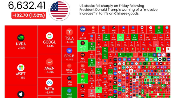 شاخص S&P 500 نیز ۲.۵ درصد افت را تجربه کرد.سهام «کوالکام» به دنبال آغاز یک بررسی انحصاری توسط چین، حدود ۷ درصد سقوط کرد.دونالد ترامپ، رئیسجمهور آمریکا، در پستی در شبکه اجتماعی «تروث سوشیال» اعلام کرد که به دلیل وضعیت فعلی، دیدار برنامهریزی شده خود با «شی جین پینگ»، رئیسجمهور چین را در حاشیه اجلاس APEC لغو کرده است.