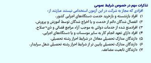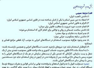 بازه سنی که افراد اعم از زن و مرد می‌توانند در این آزمون شرکت کنند ۲۰ تا ۳۰ سال عنوان شده است که در شرایط عمومی استخدام مواردی چون داشتن تابعیت ایران، اعتقاد به دین مبین اسلام یا یکی از ادیان شناخته شده در قانون اساسی جمهوری اسلامی ایران، التزام به قانون اساسی جمهوری اسلامی ایران، انجام خدمت دوره ضرورت یا معافیت قانونی برای مردان، داشتن سلامت جسمانی و روانی و توانایی برای انجام کاری که استخدام می‌شوند، عدم اعتیاد به دخانیات و مواد مخدر، نداشتن سابقه محکومیت جزایی مؤثر و عدم وجود هرگونه ممنوعیت استخدام در دستگاه‌های اجرایی ذکر شده است.
