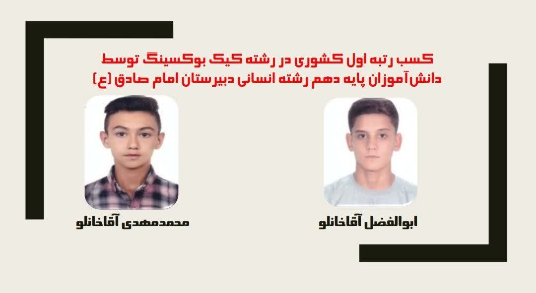 دانش‌آموزان ورزشکار پایه دهم دبیرستان امام صادق (ع) ،ابوالفضل و محمدمهدی آقا خانلو] با حضور در مسابقات کشوری کیک‌بوکسینگ ، موفق به کسب رتبه اول کشوری شدند و افتخاری ارزشمند برای مجموعه آموزش و پرورش رقم زدند.